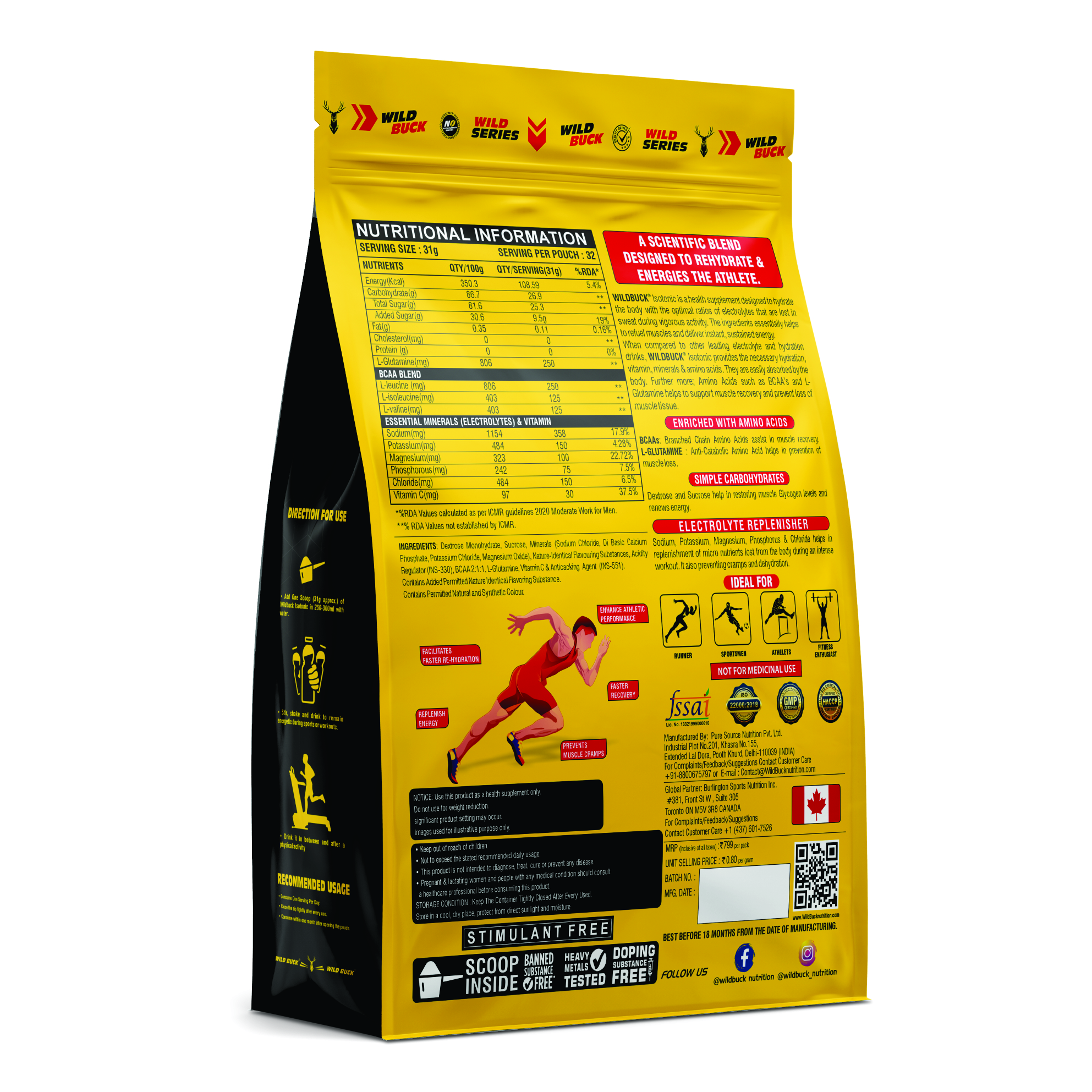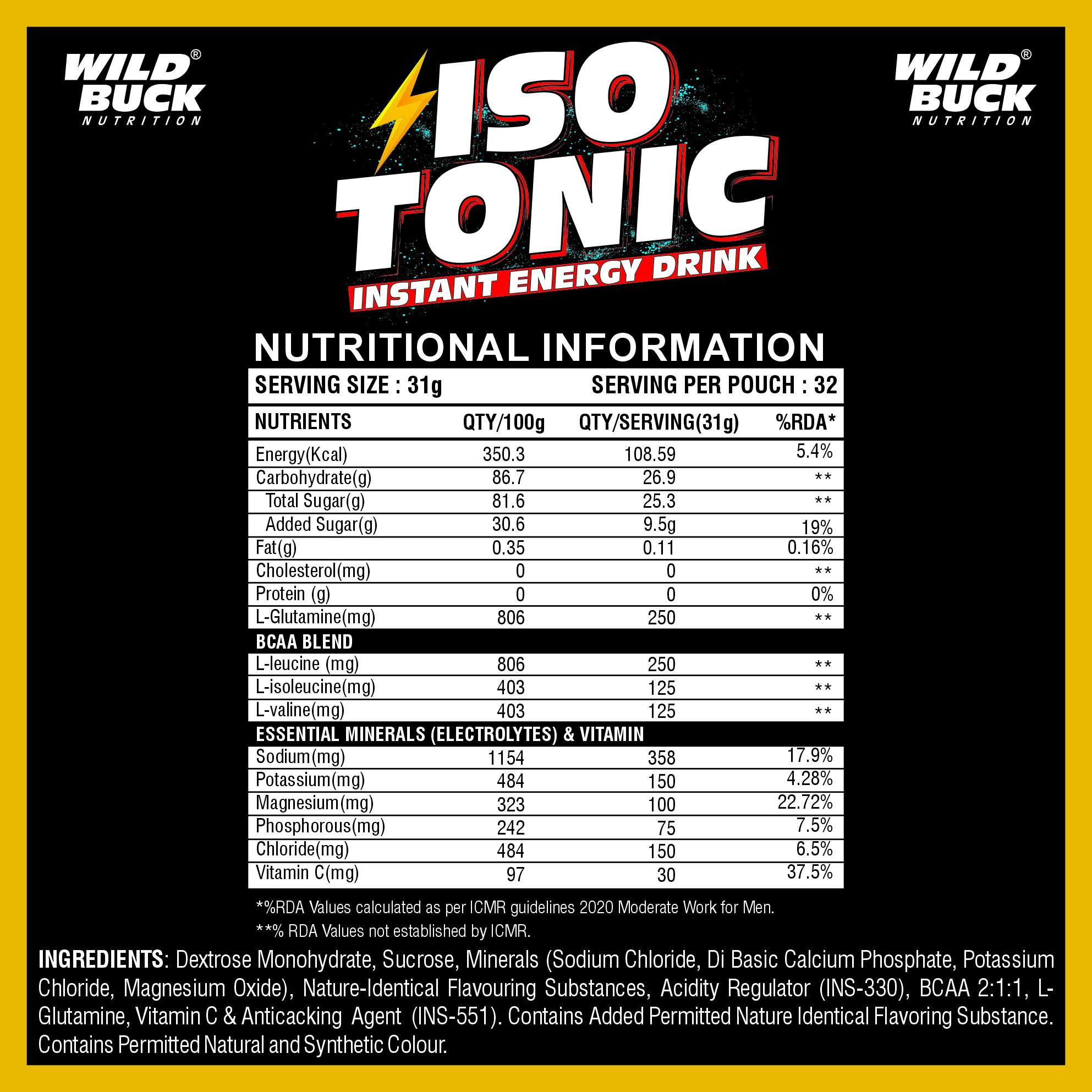 Ingredients: Dextrose Monohydrate, Sucrose, 2:1:1 BCAA Blend (L-leucine, L-Isoleucine, L-Valine), Glutamine, Vitamin C, Vitamin B3